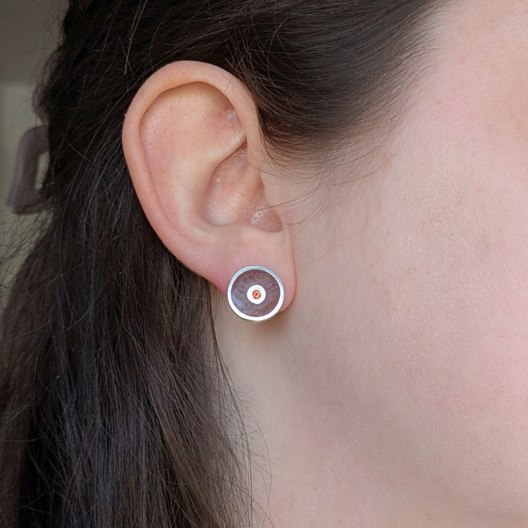 These stud earrings feature a 2mm light orange citrine with a ring of inlaid red jasper set in solid sterling silver. These studs come with large ear nuts to balance the large stud front.