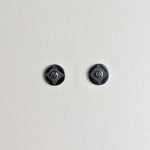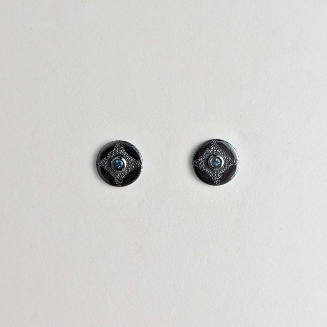 These earrings feature two bezel set blue sapphires on a speckled textured round stud front. The Sapphire Speckled Studs are made of sterling silver that has been oxidized for a darker finish.