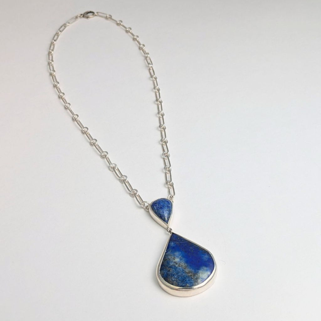 This Double Teardrop Necklace features two lapis cabochons bezel set and attached to my handmade signature chain which is fastened with a large lobster clasp.