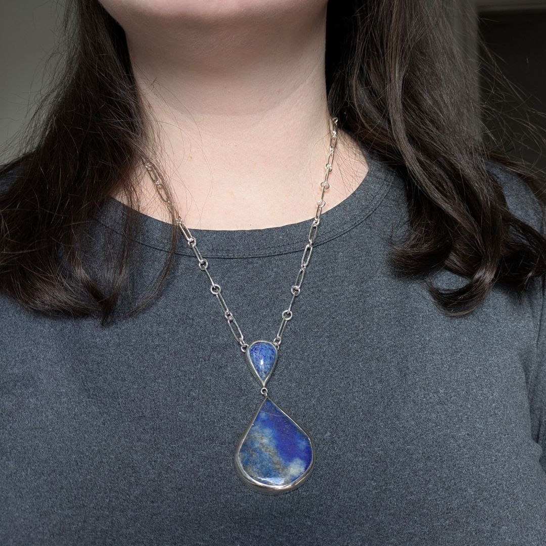 This necklace was one of the first pieces I designed and created for ACC Baltimore. I sourced these pear shaped lapis cabochons years ago. These lapis gemstones patiently waited to be made into this bold necklace.