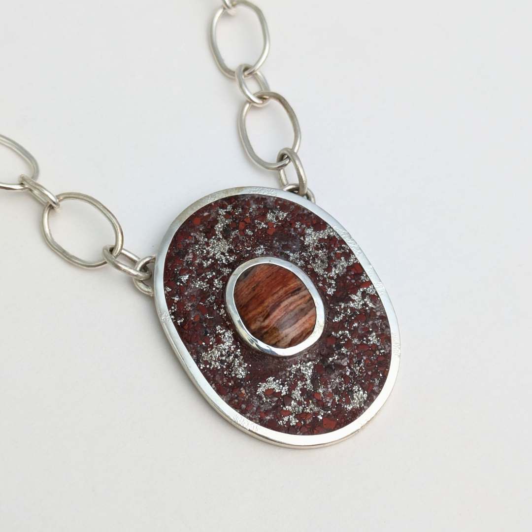 This sterling silver necklace features a bezel set red jasper gemstone surrounded by a hand inlaid crushed red jasper and silver flecks composite. This pendant hangs on a handmade oval signature sterling silver chain with a lobster clasp.