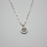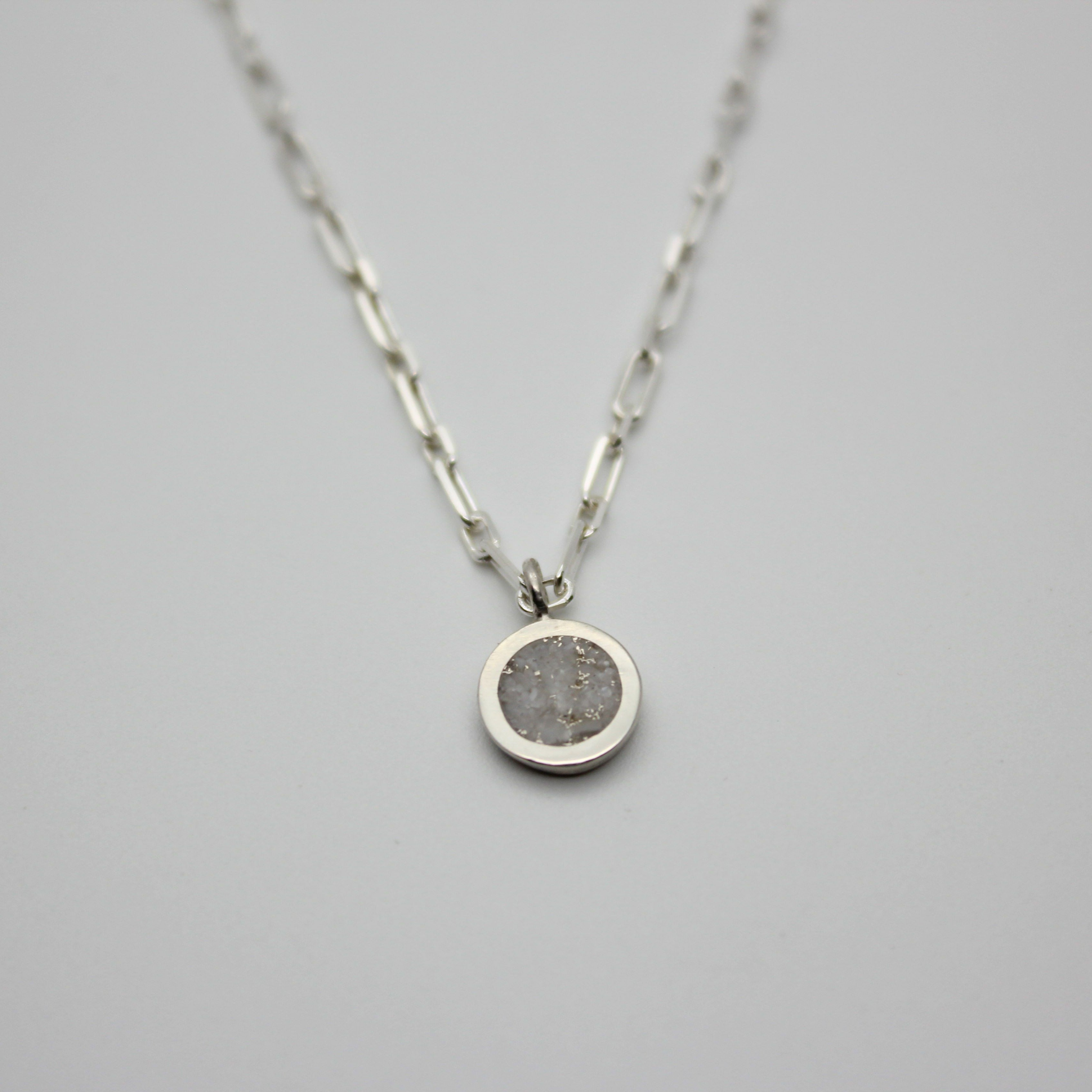Pictured: Mother-of-pearl inlay with added silver flecks set into a polished sterling silver bezel on a polished chain.