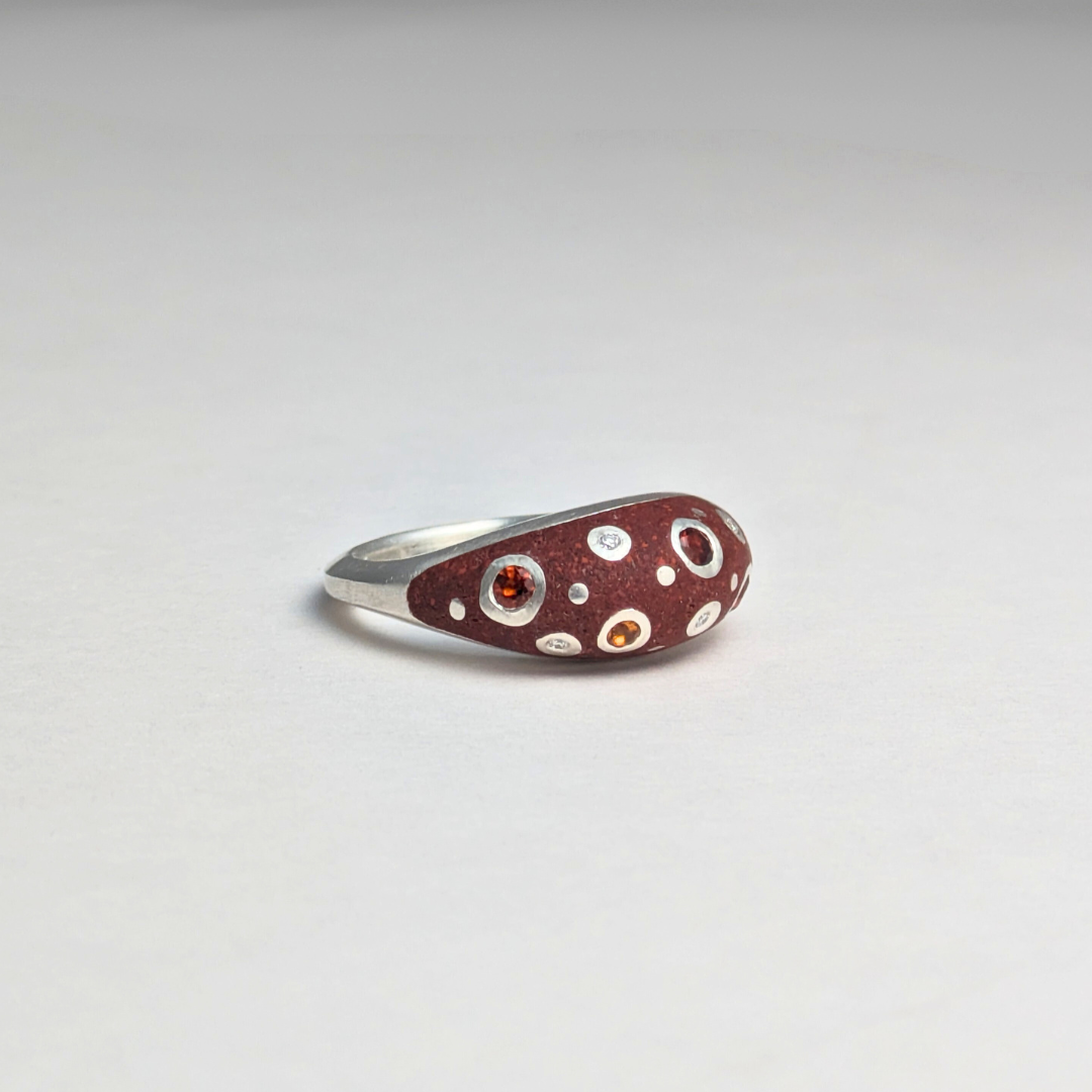 The dome profile of this ring is enhanced by the striking red jasper stone inlay. Accenting the deep red of the red jasper is the combination of madeira citrines and traditional yellow/orange citrines and white diamonds. This ring is crafted using solid sterling silver, with a polished finish for added shine.