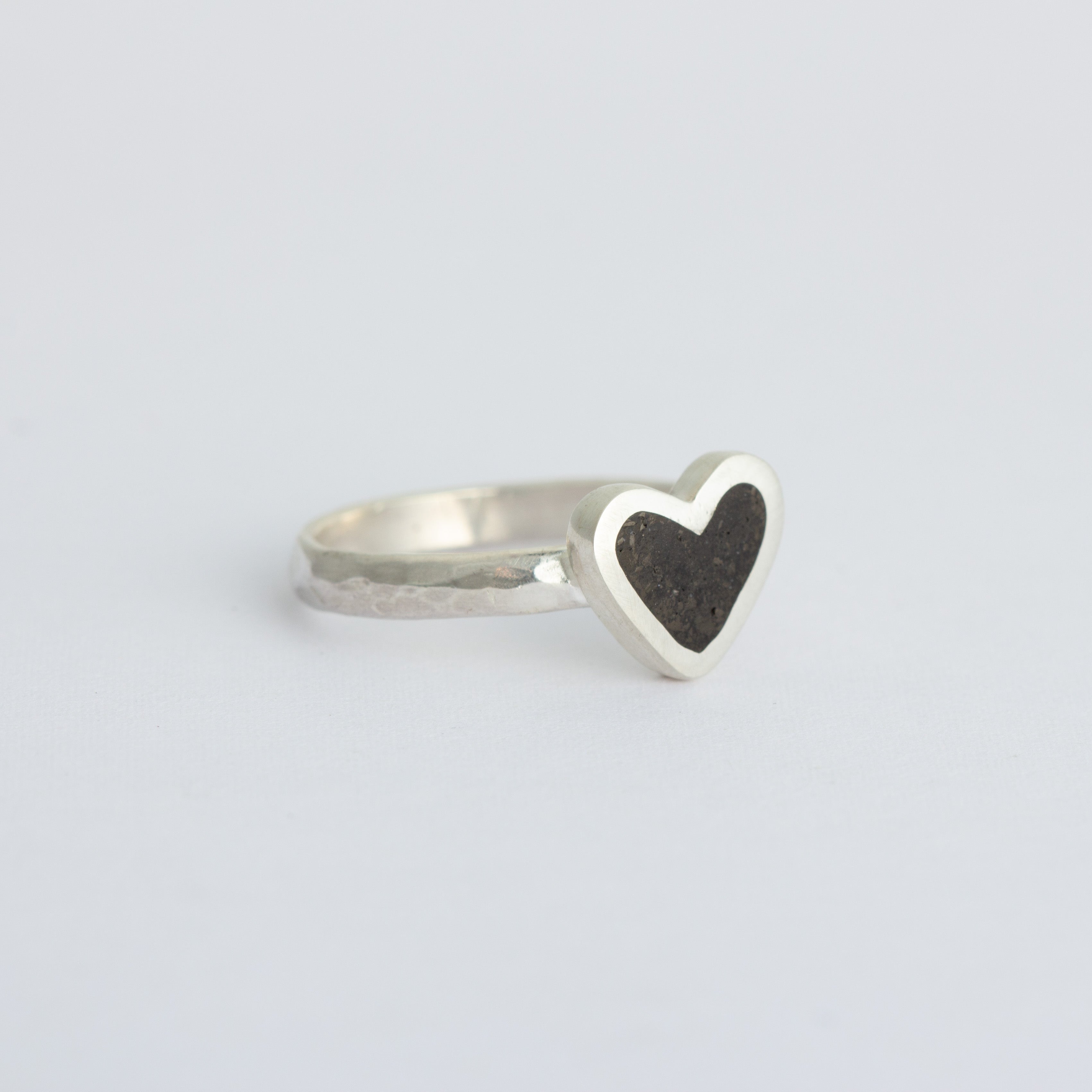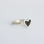 This delicate Cordate Stacking Ring features a heart shaped solitaire design with a black jet stone on a hammered band. Its simple yet elegant design adds a touch of sophistication to any look. Crafted with solid sterling silver, this ring is perfect for stacking or wearing alone.