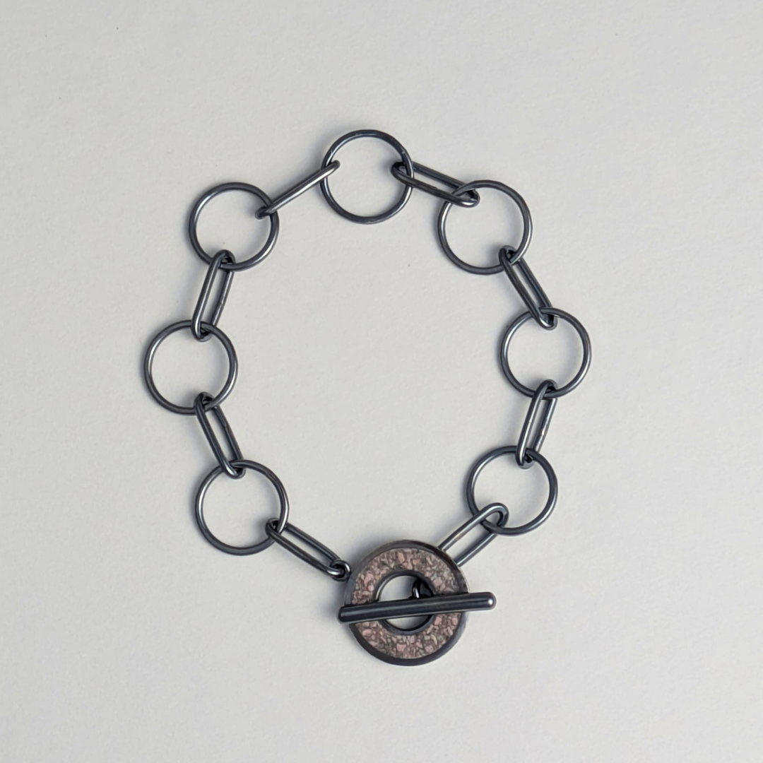 This circle chain bracelet features a round toggle clasp inlaid with crushed pink rhodonite and is fabricated in sterling silver that has been oxidized for a darker finish.