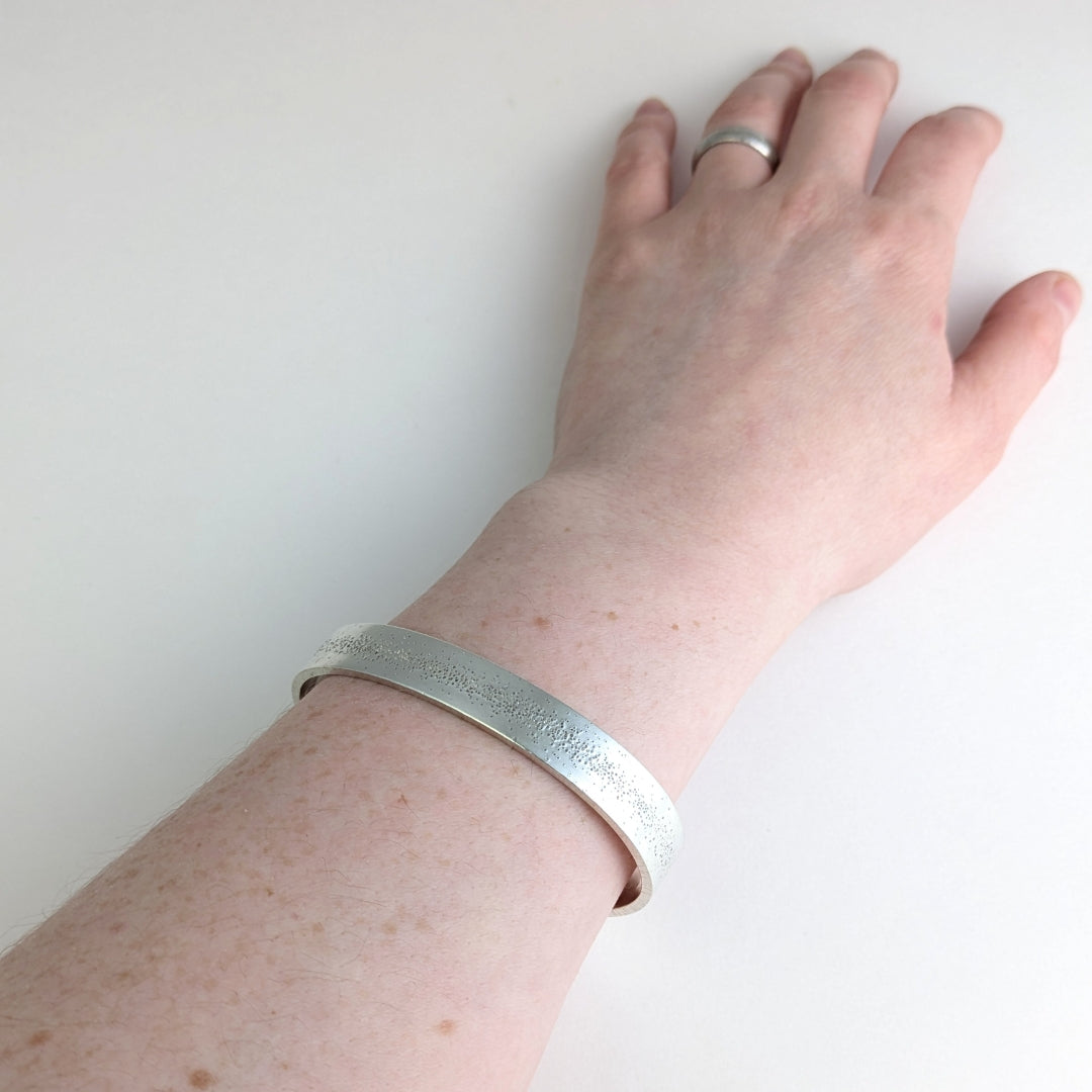 This wide cuff features speckle texture down the center of the cuff with back hammering on the sides for added shine.